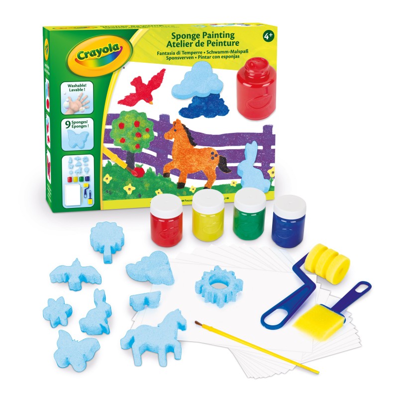 Fantasia di Tempere. Tutto il necessario per creare tante scenette con le tempere e le spugnette dalle simpatiche forme. Il set contiene anche un ruollo e un pennello di spugna per realizzare tanti effetti pittorici. Età 4+