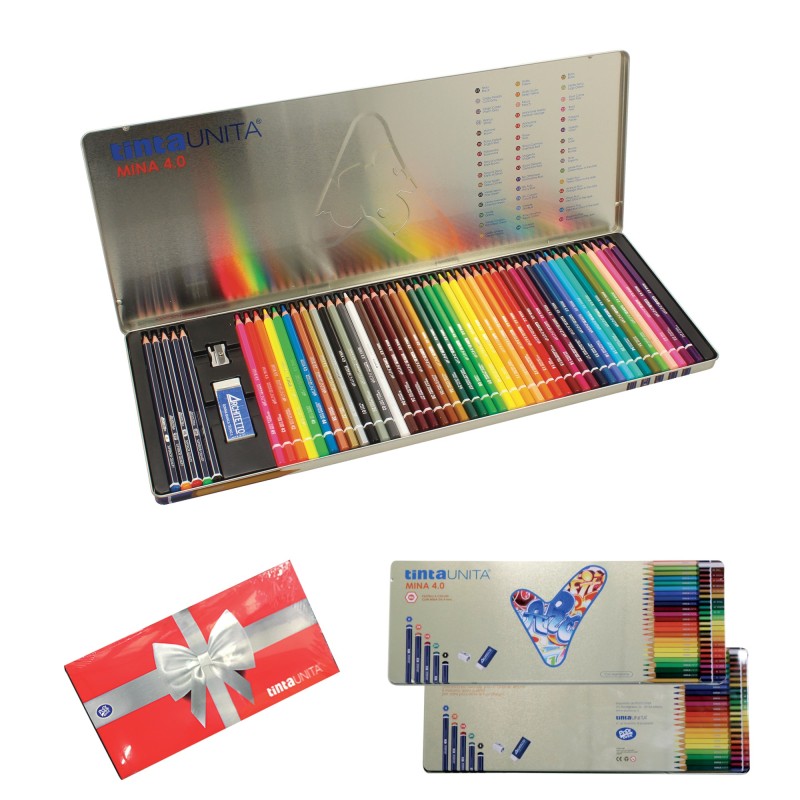 Scatola metallo composta da: 45 pastelli 4.0 Tinta Unita ( 36 standard + 3 oro/Argento/bronzo + 6 fluo) + 5 matite Architetto + 1 gomma Architetto + 1 temperamatite Architetto)