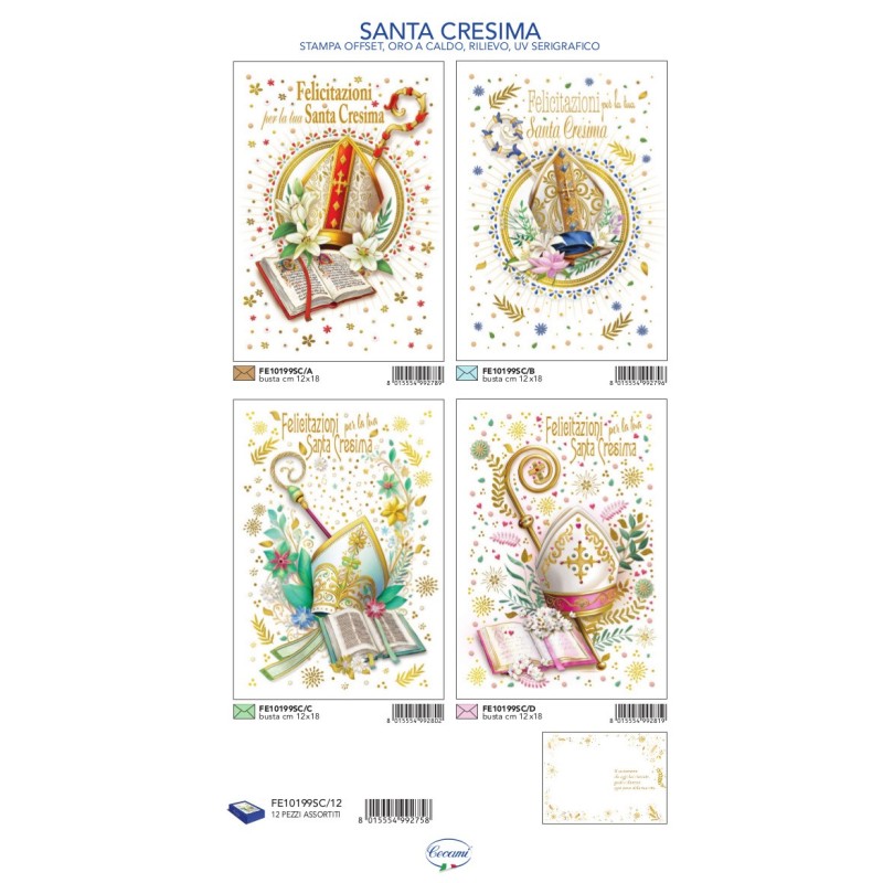 Scatola 12 Biglietti Santa Cresima 4 soggetti con oro e rilievo - stampa interna formato 12x18