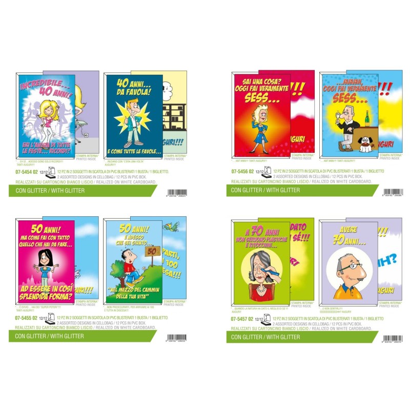 Scatola 12 Biglietti COMPLEANNO DECENNI UMORISTICI 2 sogg LUI / LEI **E** formato 12x18