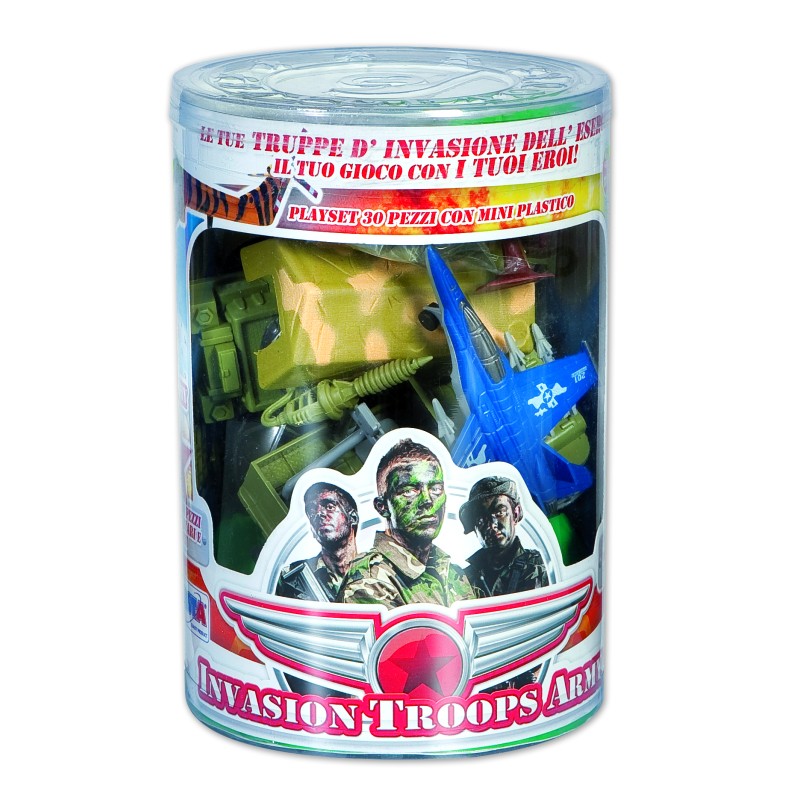 SOLDATINI IN BARATTOLO. Barattolo in plastica contenente 30 pezzi di mezzi militari e soldati con mini plastico. Età +3 anni. Dimensione cilindro h.21 cm.